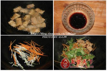 7.锅里留少许底油,下姜丝炝锅,放入胡萝卜,大葱丝炒香。